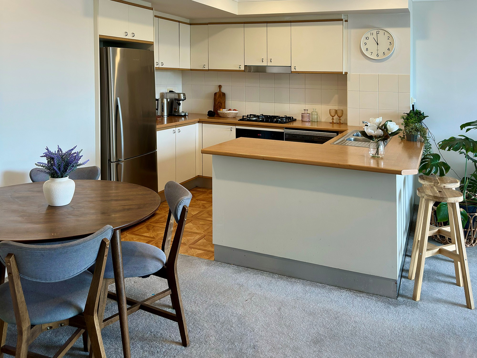 Modern kitchen with stainless steel appliances & ample storage
